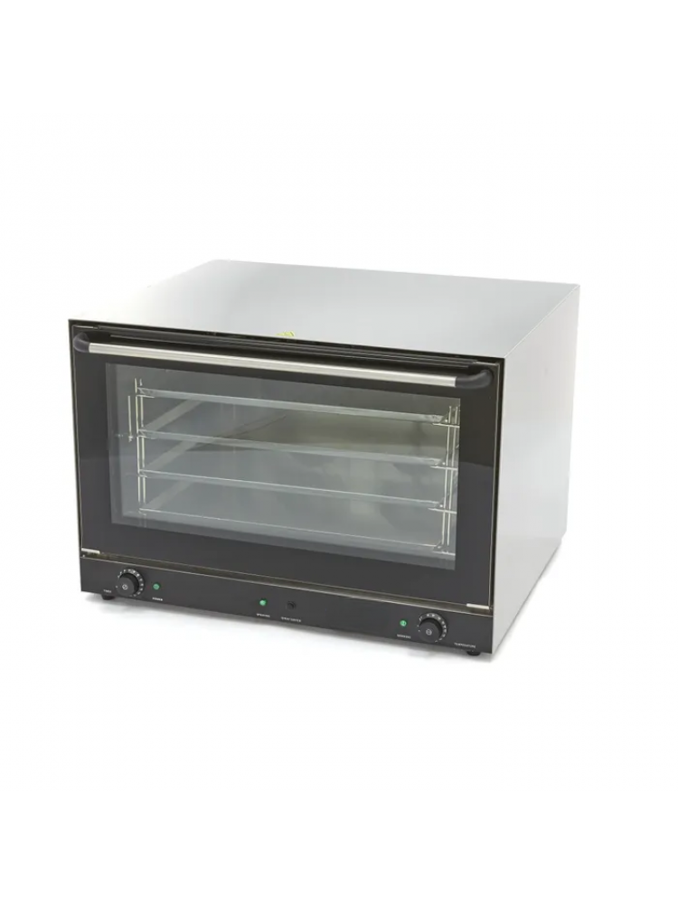 Material construído em aço inoxidável com interior esmaltado, indicadores de temperatura, controlo analógico e temporizador, porta removível com facilidade, distribuição eficiente do calor, vapor e equipado com dois motores.