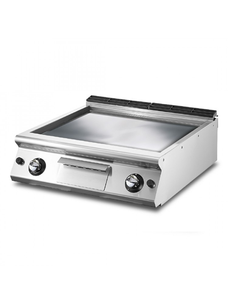 Material construído em aço inoxidável, conduta em ferro fundido esmaltado, placa de aquecimento embutida totalmente soldada e vedada na parte superior, placa de cozimento cromada, gaveta de gorduras extraível, queimadores piloto com ignição, regulação de gás com válvula de segurança, botões especialmente projetados para evitar água no painel de controlo e equipado com termostato de segurança.