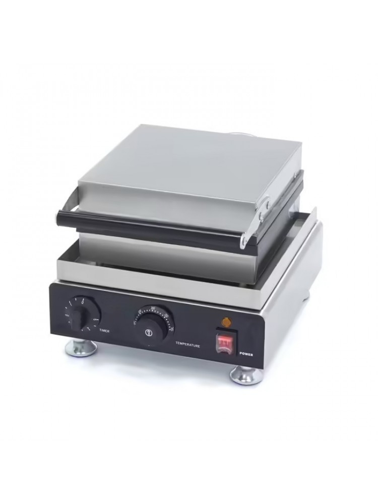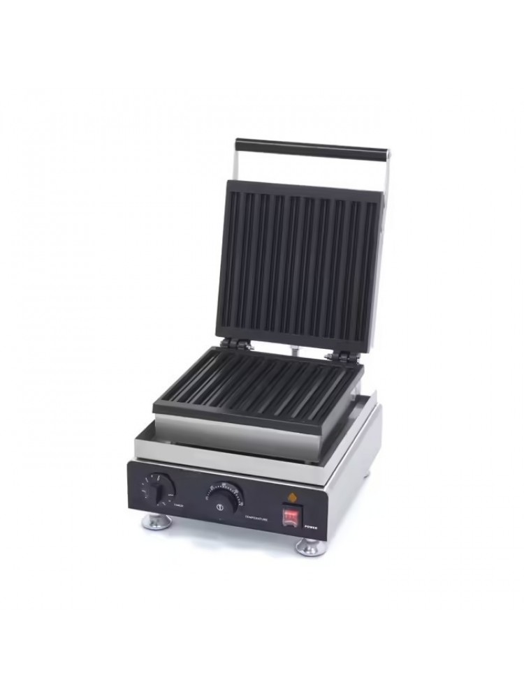Material construído em aço inoxidável e placa em alumínio com tratamento antiaderente, equipamento bastante robusto e fácil de higienizar, luz indicadora de temperatura, equipado com temporizador e termostato regulável.