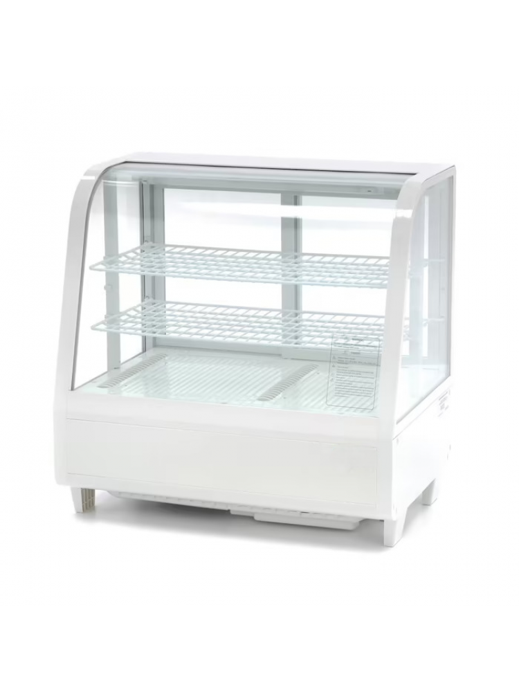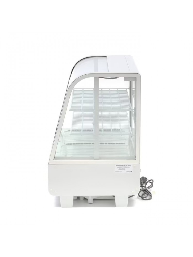 Equipamento perfeito para exposição de bancada, vidro frontal curvo, portas de correr, iluminação LED interior, duas prateleiras ajustáveis, arrefecimento através de ventilador, temperatura ajustável através de controlo digital.