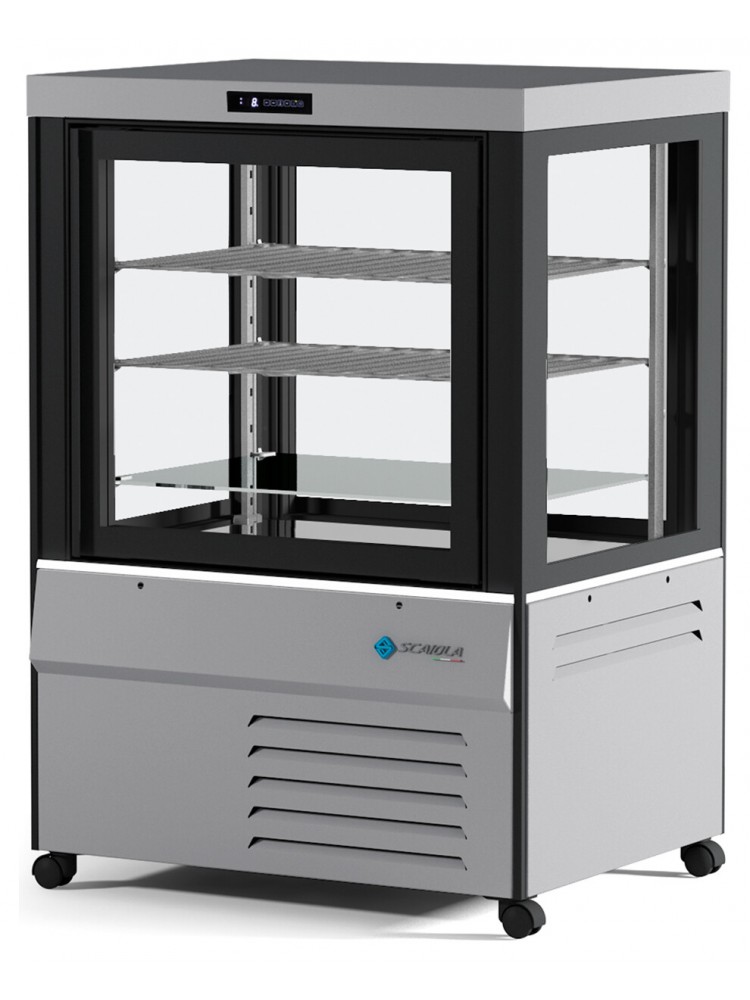 Equipamento ideal para exposição de alimentos com vidros de alta resistência térmica, porta de vidro com puxador invisível a toda a altura, evaporador de grade estática com degelo manual, iluminação interior através de luz LED, controlo de temperatura com termostato digital de toque e prateleiras de vidro resistentes ao calor.