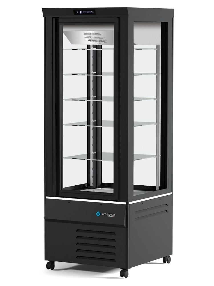 Equipamento ideal para exposição de alimentos com vidros de alta resistência térmica, porta de vidro com puxador invisível a toda a altura, descongelamento automático, iluminação interior através de luz LED, controlo de temperatura com termostato digital de toque e prateleiras de vidro resistentes ao calor.