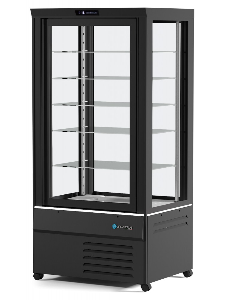 Equipamento ideal para exposição de alimentos com vidros de alta resistência térmica, porta de vidro com puxador invisível a toda a altura, descongelamento automático, iluminação interior através de luz LED, controlo de temperatura com termostato digital de toque e prateleiras de vidro resistentes ao calor.