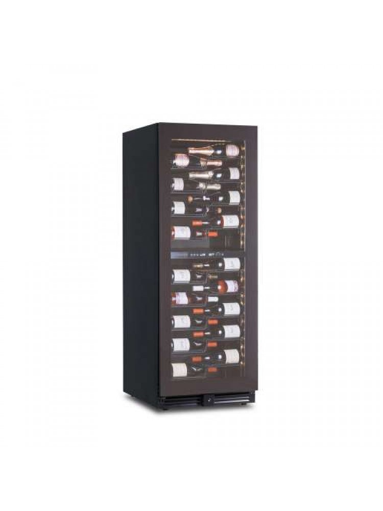 Prateleiras metálicas deslizantes, refrigeração ventilada nas duas zonas de temperatura, porta de vidro reversível, fechadura, iluminação LED e descongelação automática.
