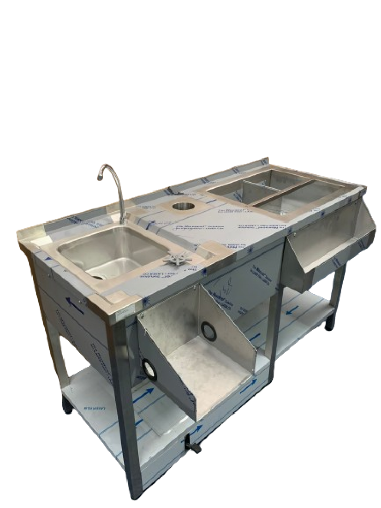 Material contruído em aço inoxidável, bastante fácil de limpar e higienizar, zona para colocar o gelo, speedrack de bebidas, pio com pedal e torneira.