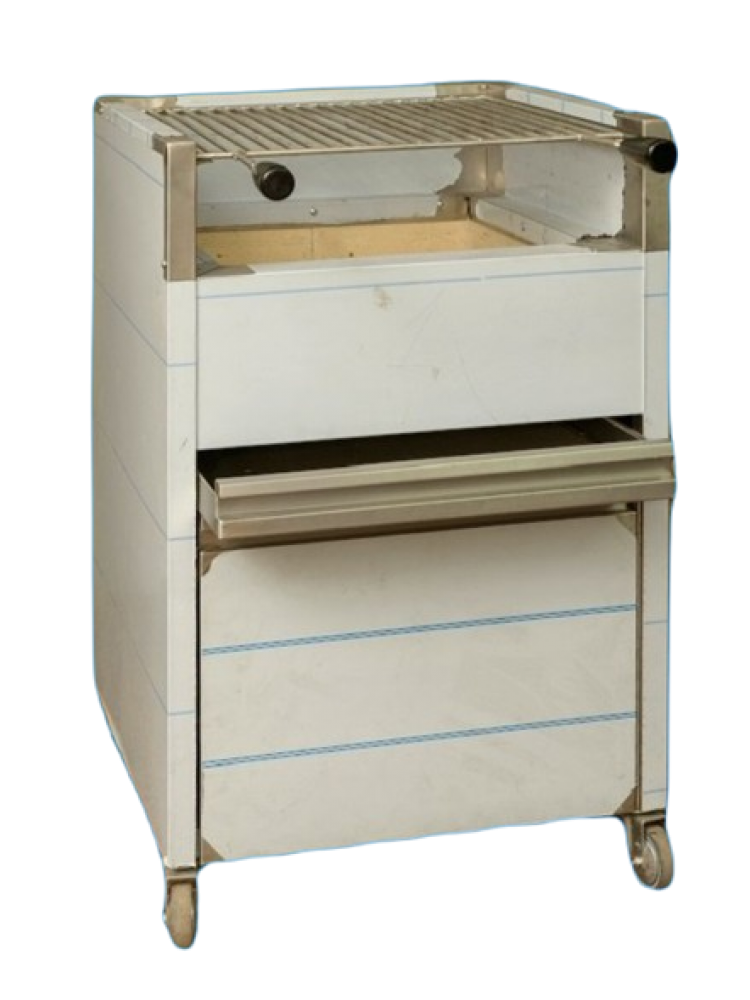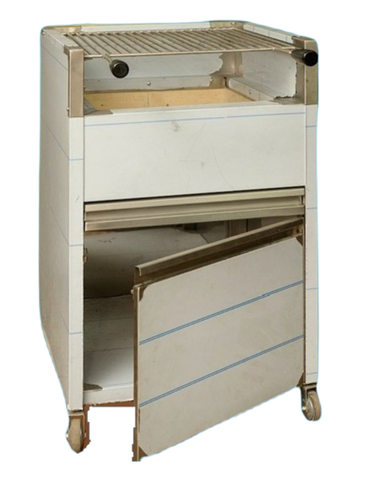 Material construído em aço inoxidável e pedra refratária, gaveta de recolha de cinzas e móvel de arrumação.