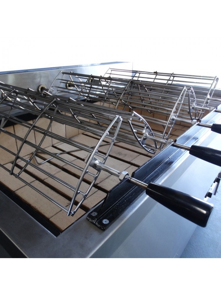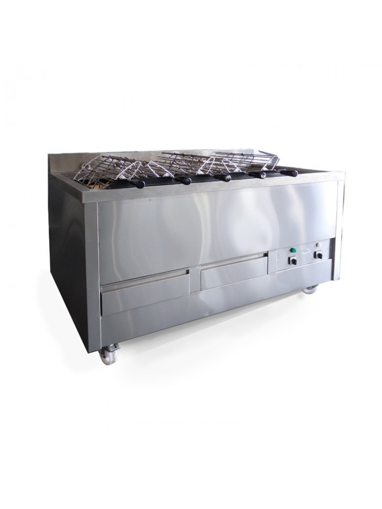 Churrasqueira a carvão com 5 grelhas rotativas e uma fixa.