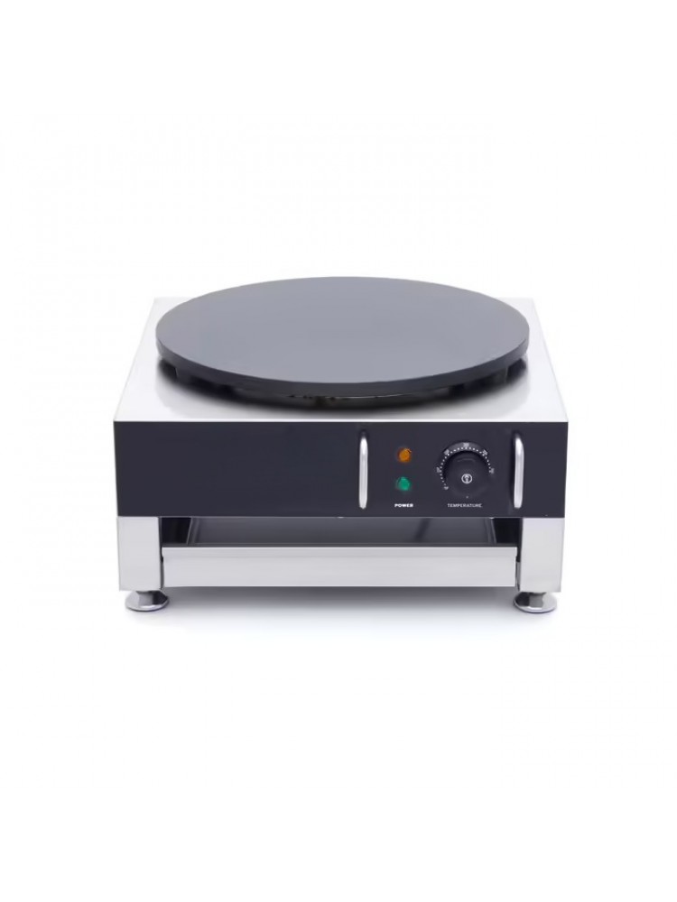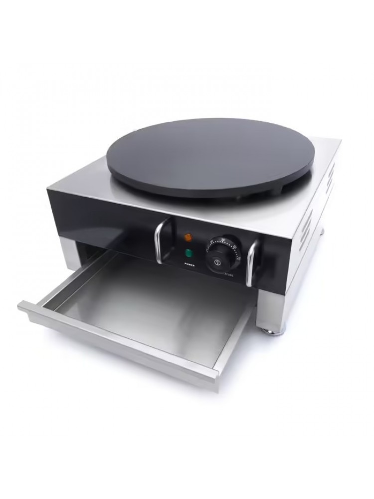 Material construído em aço inoxidável com placa em ferro fundido e revestimento anti-aderente, termostato regulável de temperatura, luz indicadora de temperatura, fácil de limpar e higienizar e gaveta inferior para armazenamento de crepes.