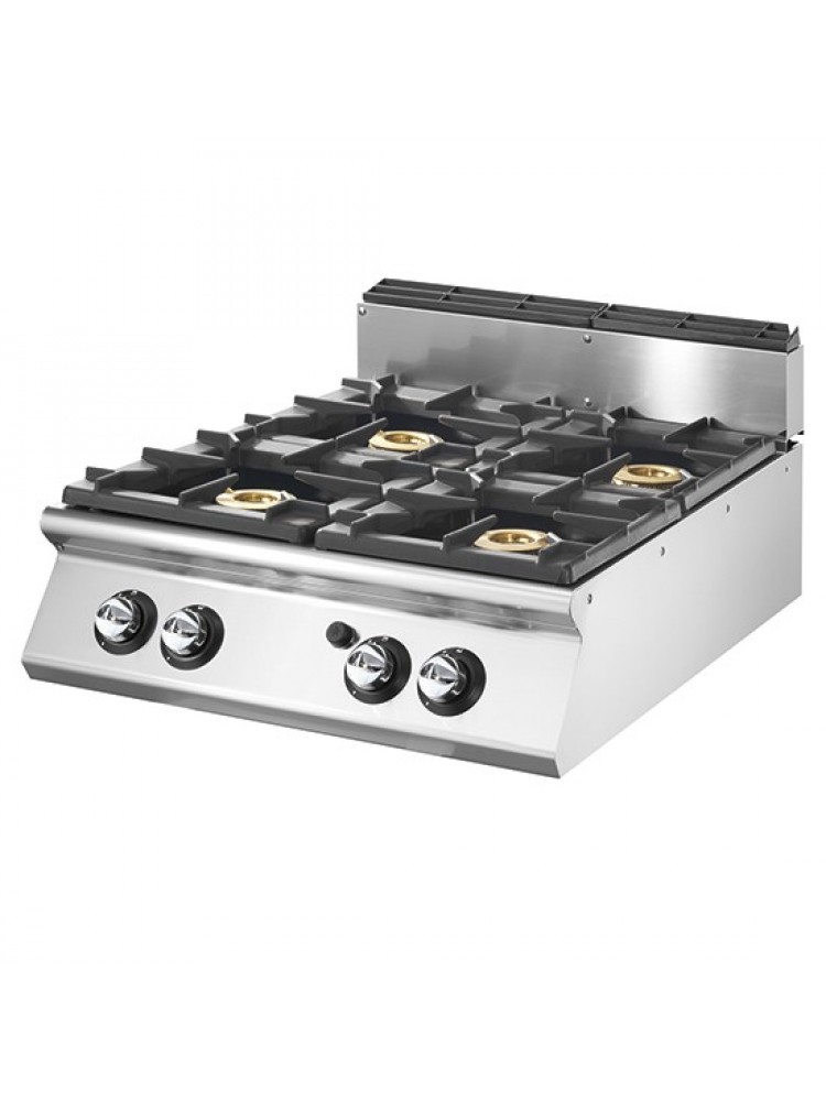 Fogão de bancada a gás com 4 queimadores industrial, ideal para o seu negócio. Painéis laterais, inferiores e traseiros em aço inoxidável. Fornecimento de gás por meio de tomadas de segurança com termopar e queimador piloto para a ignição automática do queimador principal. Queimadores rápidos fabricados em ferro fundido e latão selados no topo.Botões de design especiais para evitar a penetração de água no painel de controle. Pés ajustáveis.Especificação