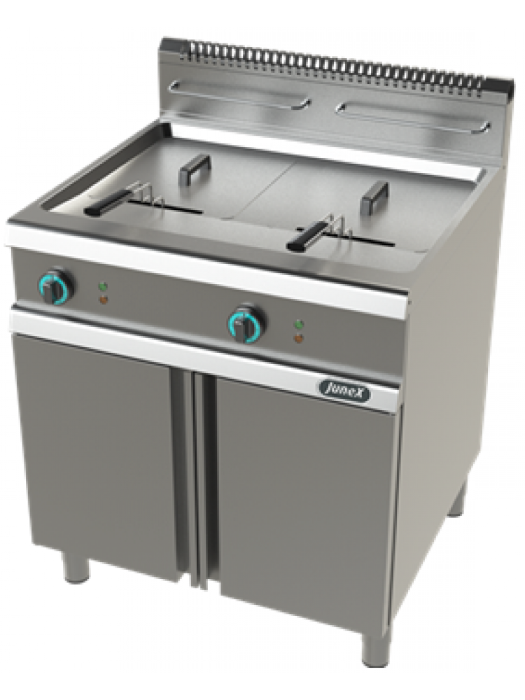 Material construído em aço inoxidável, cuba em aço inoxidável prensada em forma-V, com cantos arredondados para permitir limpeza fácil e evita acumulação de sujidades, queimadores com piloto e acendimento por isqueiro elétrico, válvula termostática com regulação de temperatura até 190ºC, termostato de segurança contra sobreaquecimento, drenagem do óleo através de torneira canalizado para gaveta posicionada debaixo da cuba, alimentação elétrica (230V) para acendimento e segurança.