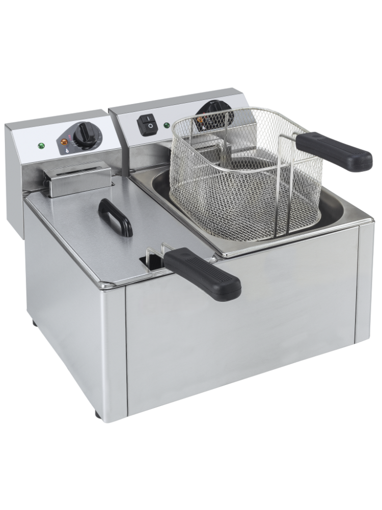 Fritadeira Elétrica Formifri 4 + 7 Litros industrial, ideal para o seu negócio.Material construído em aço inoxidável, termostato de controlo de temperatura, termostato de segurança com rearme manual, painel de controlo amovível (com sistema de segurança) para limpeza fácil e zona fria para acumulação de resíduos.Especificação