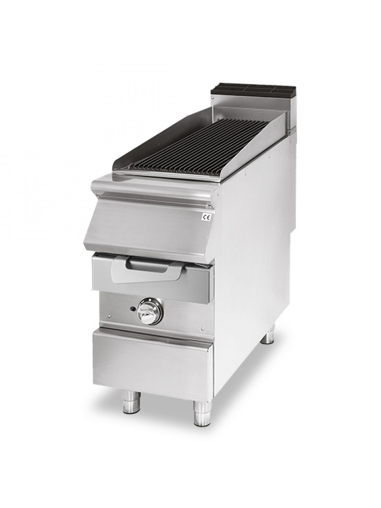 Material construído em aço inoxidável, conduto em ferro fundido, espaldar para evitar salpicos, bandeja removível de coleta de gorduras, aquecimento por queimador localizado sob a grelha de cozimento e proteção de botões para evitar entrada de água.