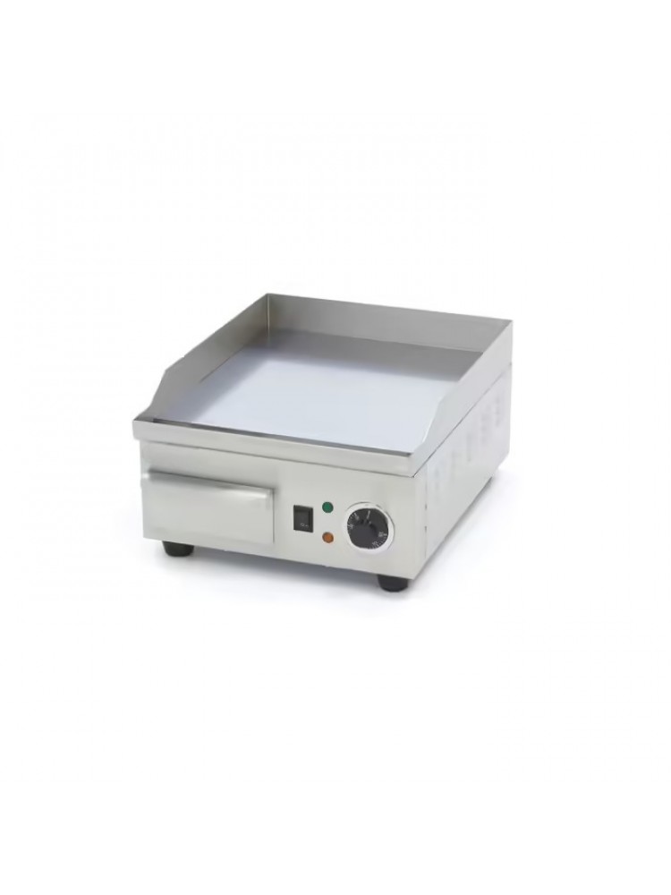 Material construído em aço inoxidável, fácil de limpar e higienizar, termostato regulável de temperatura, aquecimento homogéneo, gaveta de recolha de gorduras, espaldar para evitar salpicos e luz indicador de temperatura.