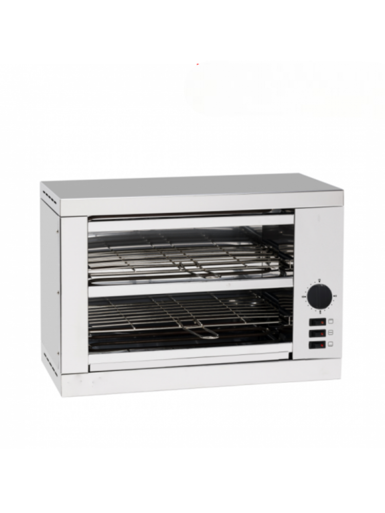 Material construído em aço inoxidável, aquecimento independente das resistências, grelhas de proteção, grelha removível com pega, aparador de migalhas e temporizador.