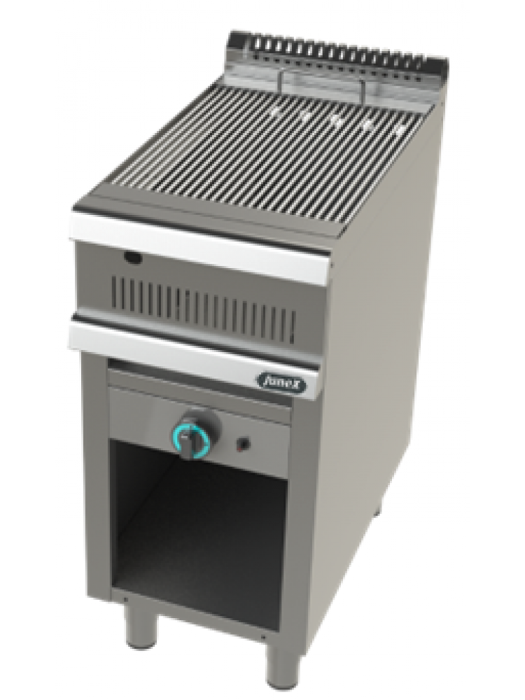 Material construído totalmente em aço inoxidável, grelha para alimentos, painel de comandos, tabuleiro de limpeza, extensa área de confeção, grelhas com perfil redondo, equipado com piloto e queimador tubular, defletores de alto rendimento que evitam contacto da chama com os alimentos, equipado com quatro filiais de chama por queimador, dispositivo de acendimento por isqueiro elétrico, dispositivo de deteção de chama termopar, área inferior para arrumação dos utensílios, facil de limpar e higienizar, pés ajustáveis em altura.