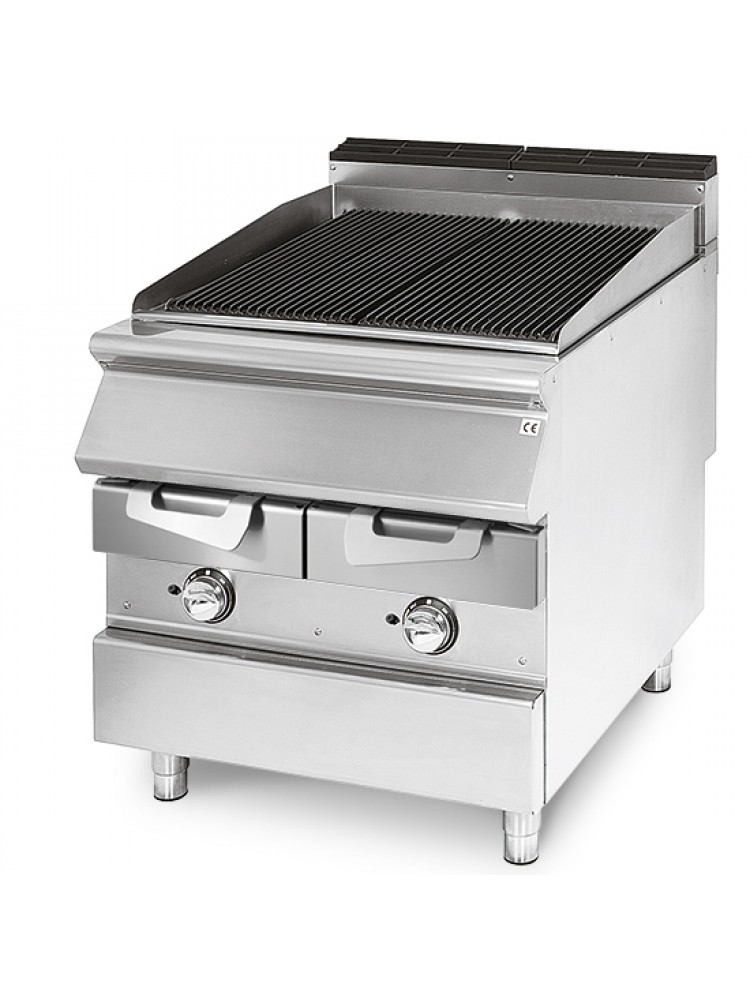 Material construído em aço inoxidável, conduto em ferro fundido, espaldar para evitar salpicos, bandeja removível de coleta de gorduras, aquecimento por queimador localizado sob a grelha de cozimento e proteção de botões para evitar entrada de água.