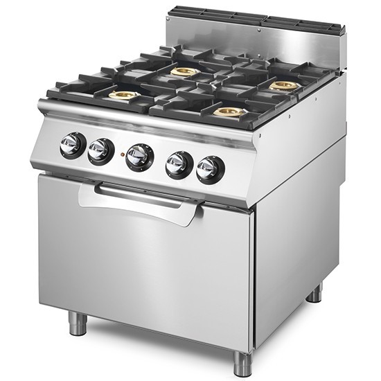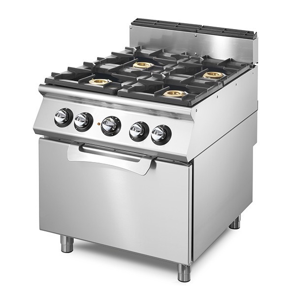 Material construído em aço inoxidável, fácil de limpar e higienizar, durabilidade, robustez e fiabilidade assegurado, painel de comandos, pingadeira e tabuleiro para recolha de gorduras, chaminé, tabuleiro de limpeza, queimadores com dupla coroa em latão, equipados com válvulas de segurança termopar e grelhas robustas em ferro fundido, forno com 3 níveis, puxador ergonómico em aço inoxidável e isolamento de calor bastante eficiente.