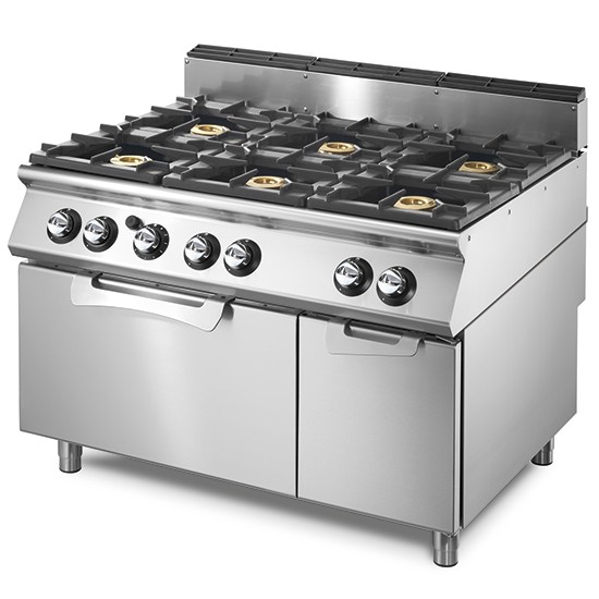 Fogão a gás com 6 queimadores e um forno GN2/1 industrial, ideal para o seu negócio.