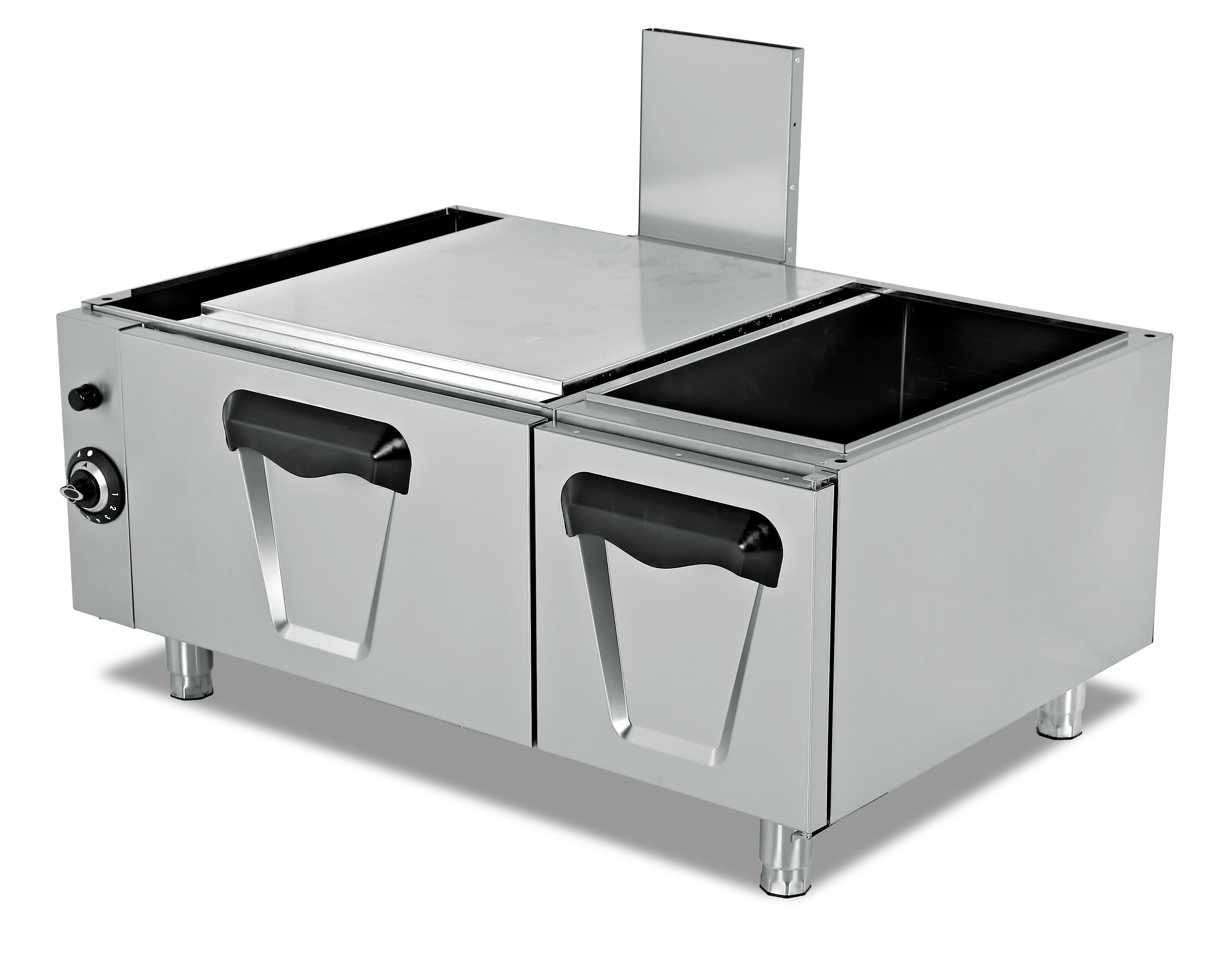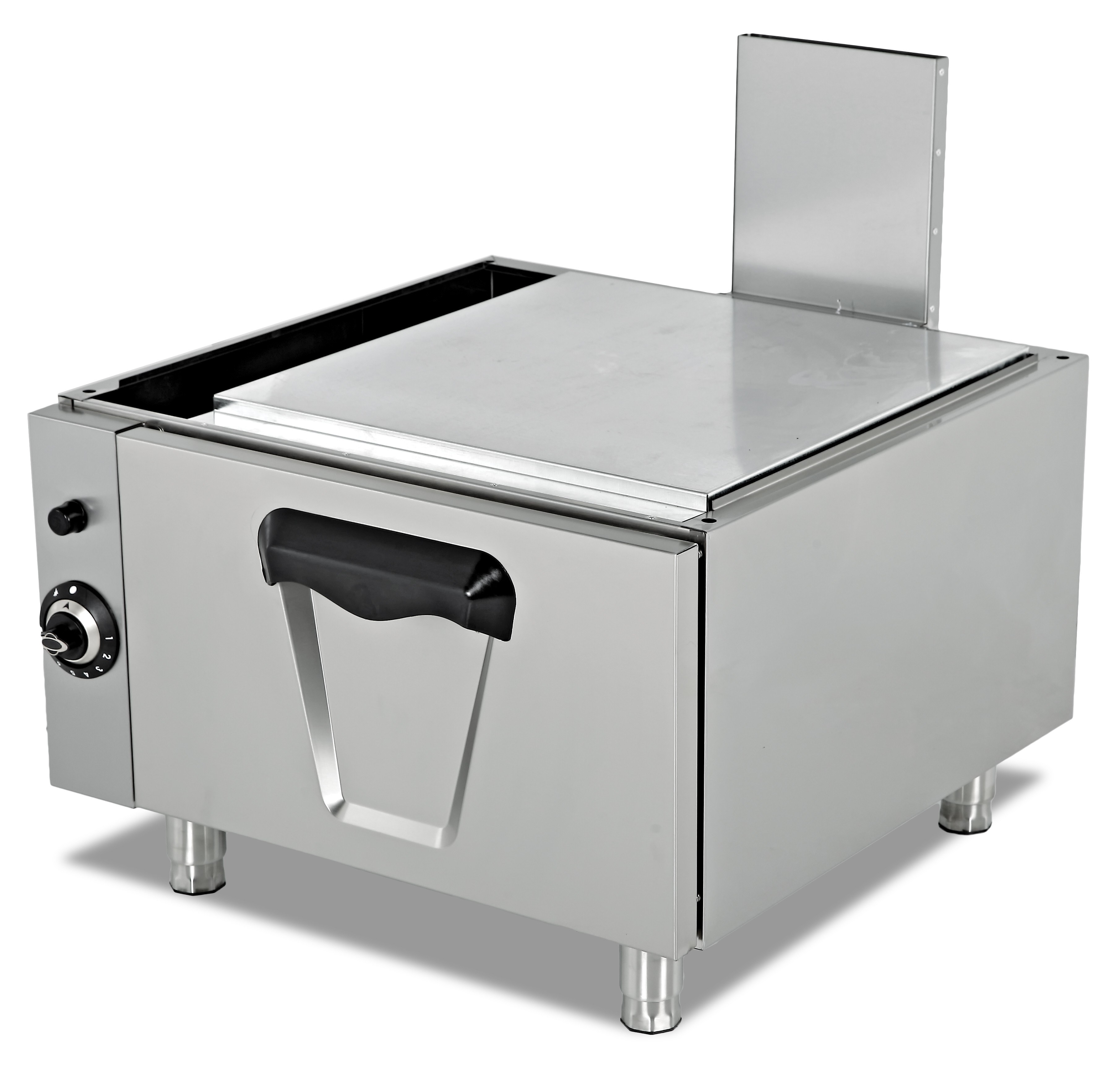 Material em aço inoxidável, controlo termostático, aquecimento em duas zonas, fácil de limpar e higiénico.