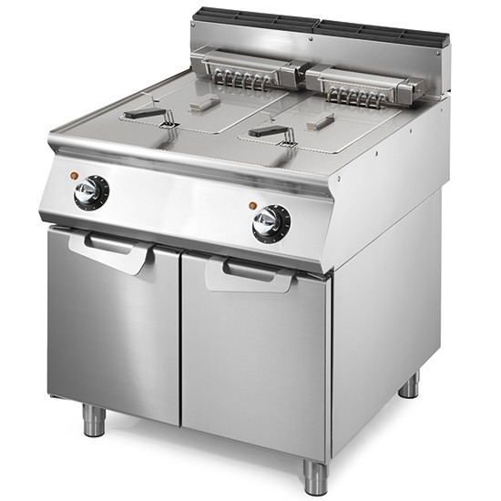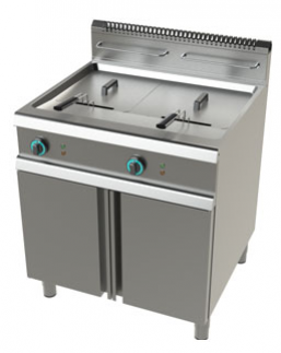 Material construído em aço inoxidável, elevada qualidade, robustez, durabilidade, fácil de higienizar, elementos de aquecimento basculantes, queimadores em aço inox com piloto e acendimento por isqueiro elétrico, queimadores com elevada eficiência exteriores à cuba, válvula termostática com regulação da temperatura até 190ºC, segurança contra sobreaquecimento, cesto em arame de aço niquelado com pega ergonómica, drenagem do óleo através de torneira canalizado para gaveta posicionada debaixo da cuba.