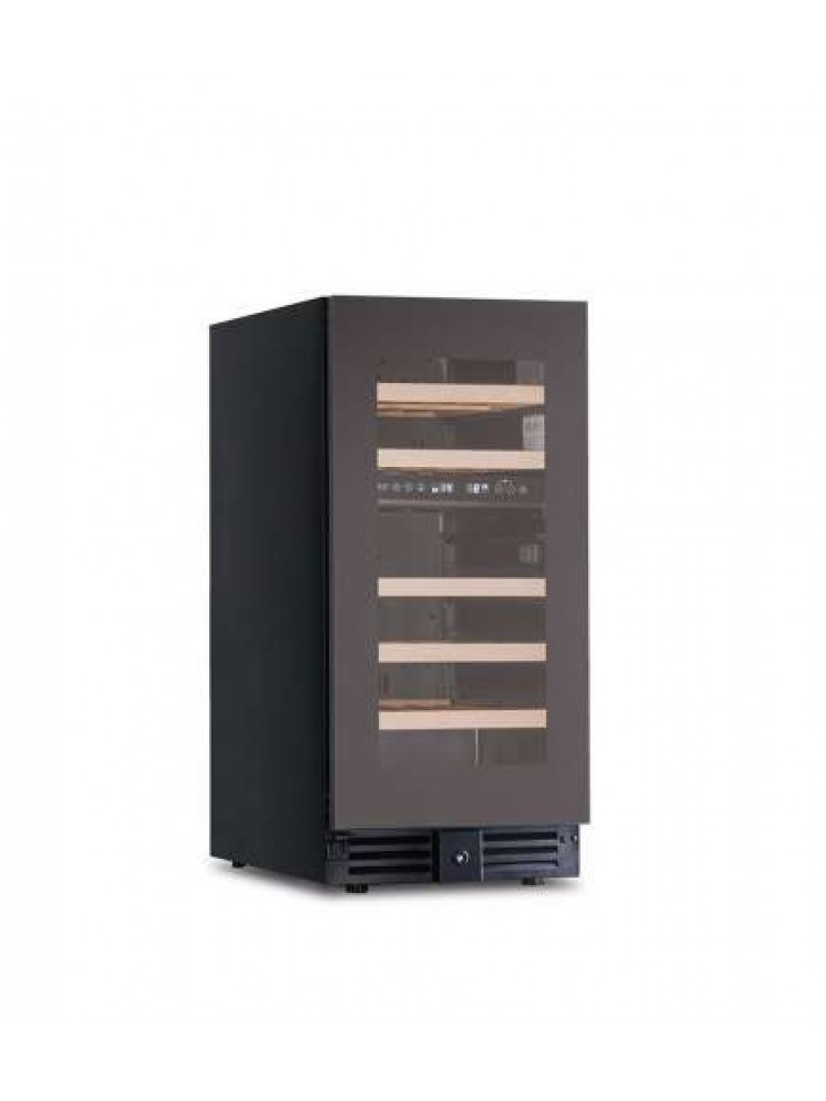 Prateleiras em madeira amovíveis, refrigeração ventilada nas duas zonas de temperatura, porta de vidro reversível, fechadura, iluminação LED e descongelação automática.