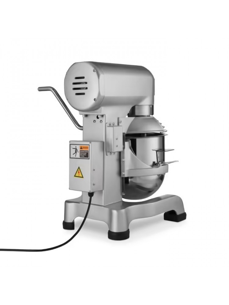 Material construído em aço inoxidável, velocidade ajustável, elevação da taça com alavanca e interruptor de segurança, grelha de proteção, interruptor de segurança, botões de arranque e de paragem em separado.