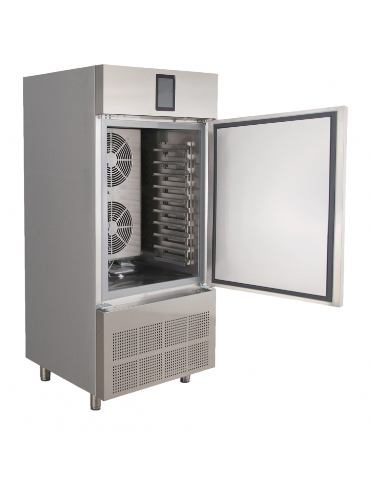 Material construído em aço inoxidável, controlador de ecrã tátil, termostato programável, exportação de dados para conformidade HACCP, carregar ou transferir dados via USB, guias para tabuleiros GN 1/1 e Euronorm, sonda de núcleo incluída, porta reversível com fecho automático, pés reguláveis. (Refrigeração de +70ºC a +3ºC) 40 kg em 90 mins / (Congelação de +70ºC a -18ºC) 28 kg em 240 mins.