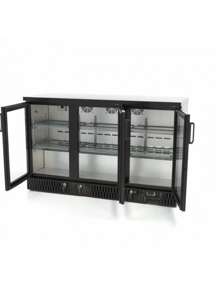 Material construído em aço inoxidável, iluminação LED interior, termostato de temperatura regulável, controlo digital, prateleiras ajustáveis em altura, porta com vidro duplo, fechadura e sistema de arrefecimento ventilado.