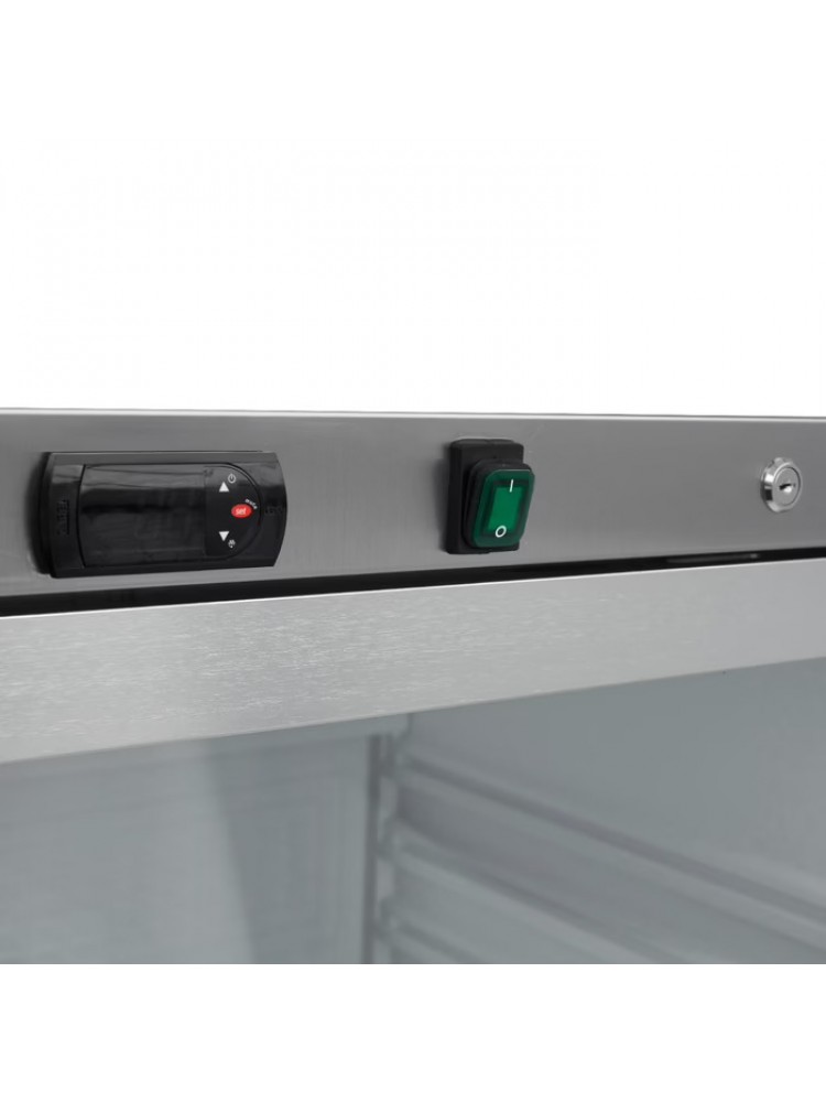Material construído em aço inoxidável, controlo eletrónico da temperatura, ciclo de arrefecimento para evitar a formação de gelo, prateleiras reguláveis e fechadura.