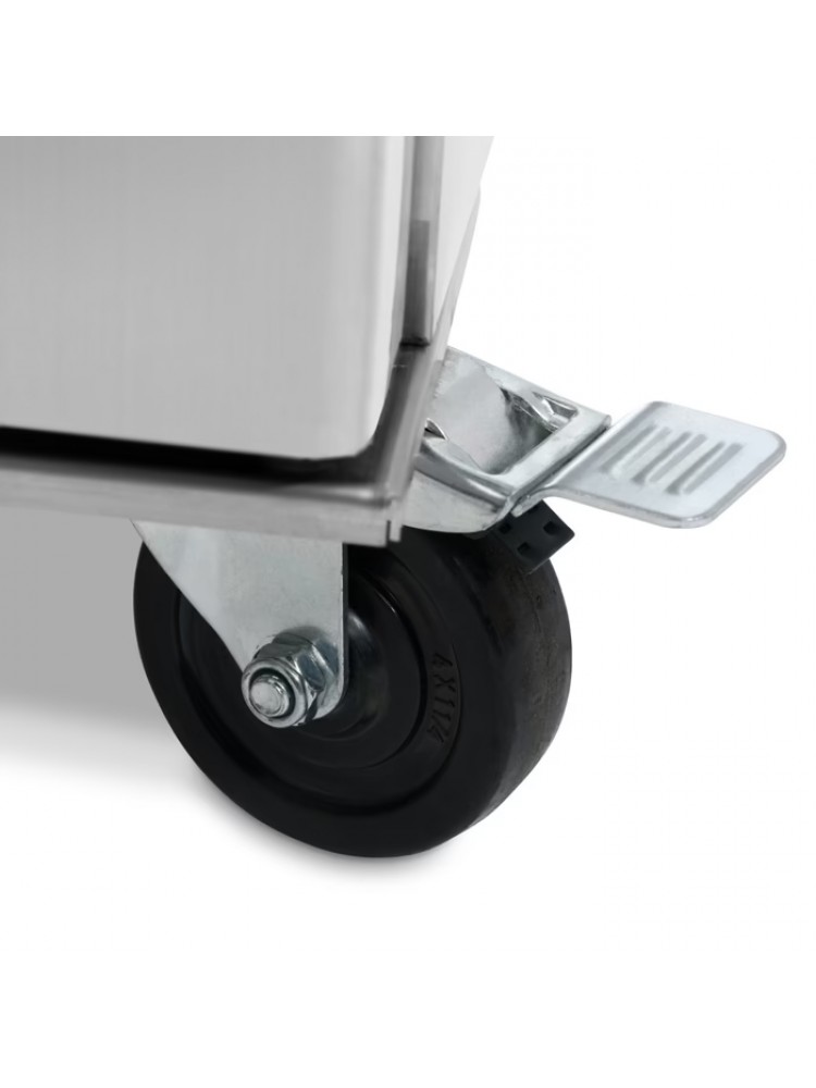 Material construído em aço inoxidável, sistema de refrigeração que permite o peixe não secar, descongelação automática, iluminação LED, controlo de temperatura digital, porta com fechadura, rodas para facilitar o transporte, fácil de limpar e higienizar.