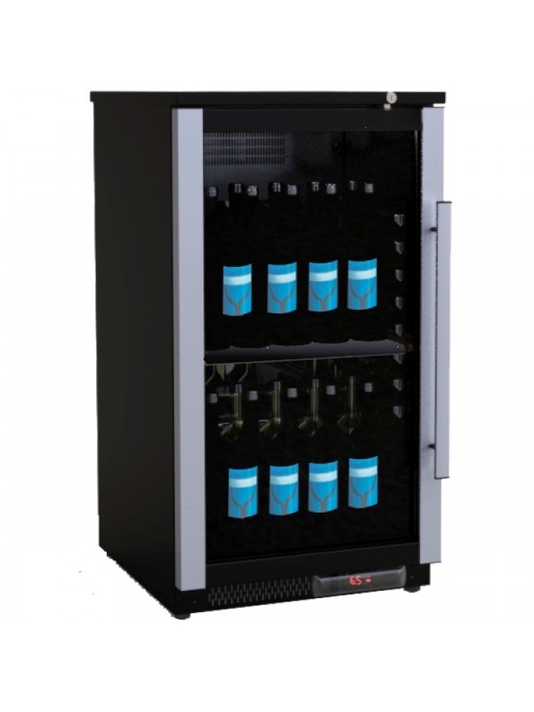 Material de alta qualidade, com iluminação LED que favorece a conservação e as propriedades do vinho, porta de vidro com filtro UV para proteger as garrafas da luz exterior e prateleiras de madeira com trava para garantir a segurança das garrafas.