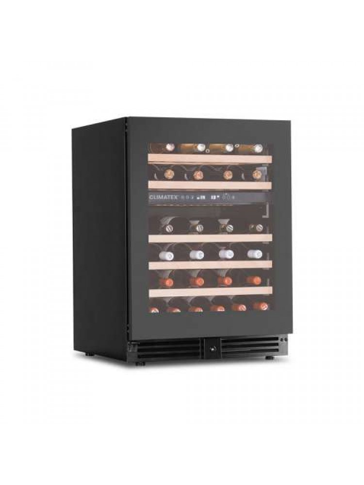 Prateleiras em madeira amovíveis, refrigeração ventilada nas duas zonas de temperatura, porta de vidro reversível, fechadura, iluminação LED e descongelação automática.