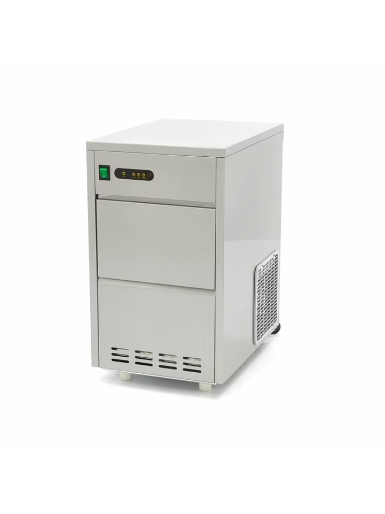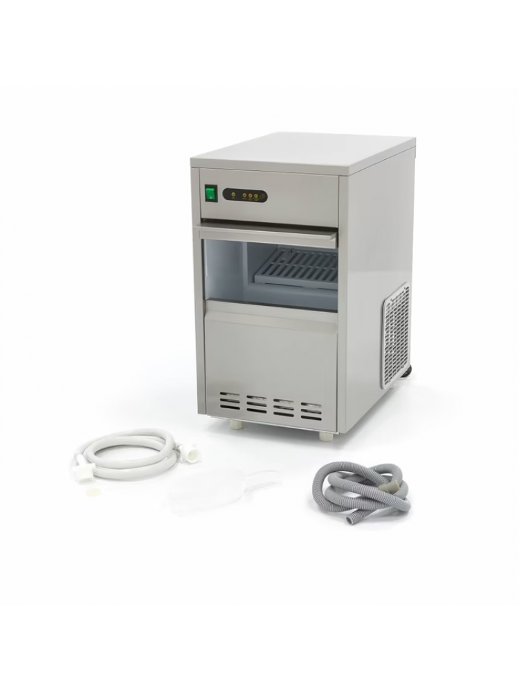 Material construído em aço inoxidável, painel de controlo de fácil utilização luzes indicadoras de nível de armazenamento e de nível de água baixo, cuba de armazenamento (10 Kg), válvula de água, proteção contra sobreaquecimento e sistema de arrefecimento.