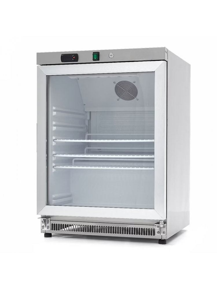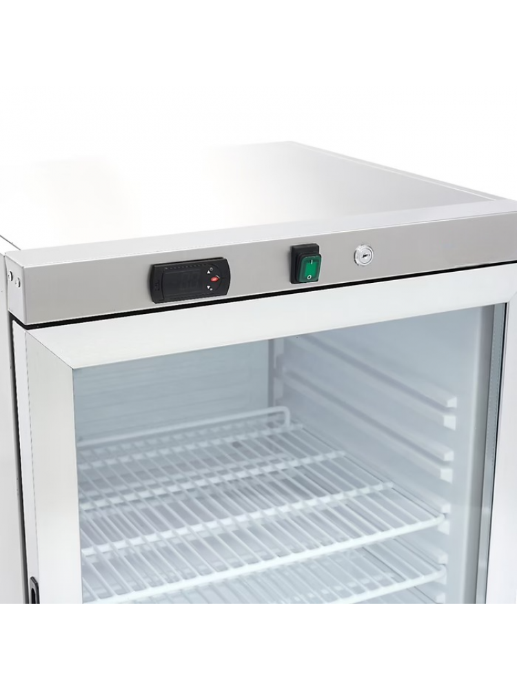 Material construído em aço inoxidável, temperatura ajustável, vedação de borracha amovível, prateleiras ajustáveis, porta com fechadura, pés frontais e rodas traseiras.