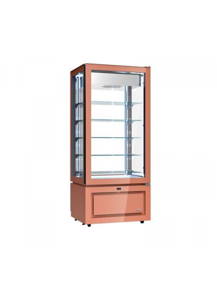 Material serigrafado a Sablè (nova cor), porta de vidro com pega invisível, iluminação LED interior com sensor de proximidade PIR Sense que altera a intensidade da luz à medida que os clientes de aproximam, descongelação automática, refrigeração ventilada com evaporador, placa eletrónica com alarmes HACCP e rodas integradas ocultas.