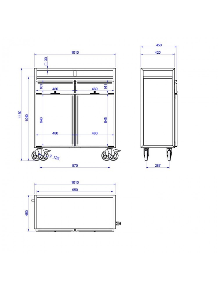 Equipamento bastante robusto, totalmente soldado, corrimão superior que proporciona segurança e facilidade de transporte, painéis de madeira, gavetas com guias, amortecedores e travamento, prateleira intermédia com altura regulável e rodas bastante resistentes.