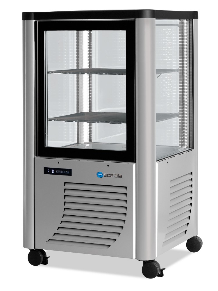 Equipamento ideal para exposição de alimentos com vidros de alta resistência térmica, porta de vidro com puxador invisível a toda a altura, evaporador de grade estática com degelo manual, iluminação interior através de luz LED, controlo de temperatura com termostato digital de toque.