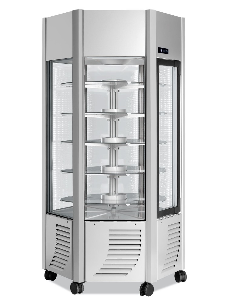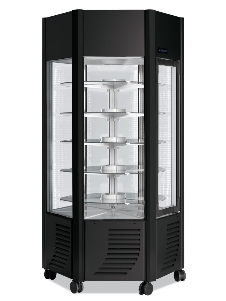 Equipamento ideal para exposição de alimentos com vidros de alta resistência térmica, porta de vidro com puxador invisível a toda a altura, descongelamento automático, iluminação interior através de luz LED, controlo de temperatura com termostato digital de toque, prateleiras de vidro resistentes ao calor, prateleiras rotativas.