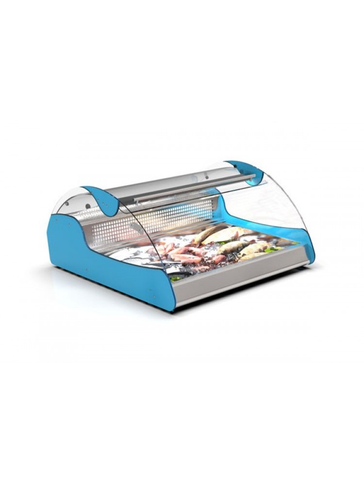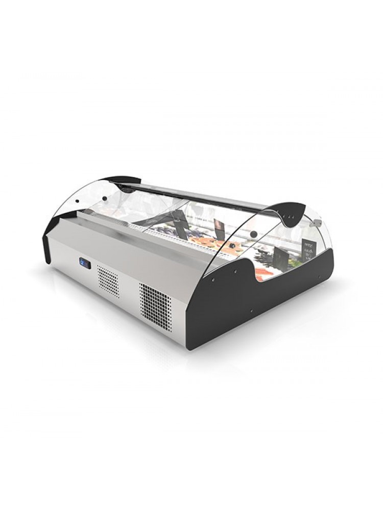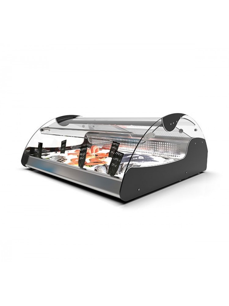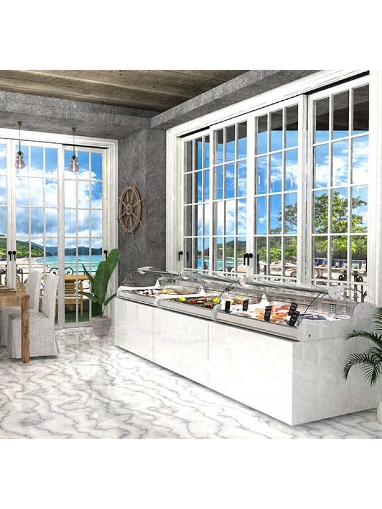 Design muito atrativo de duplo acesso para exposição de peixe, saladas, sobremesas e alimentos frescos em geral, equipado com uma bandeja fria e um evaporador estático para garantir frescura na "zona alimentar" sem secar o produto, espaço de motor oculto ao cliente, ampla visão panorâmica com vidros deslizantes temperados, high power LEDs de última geração e modelo compacto que não precisa de instalação.