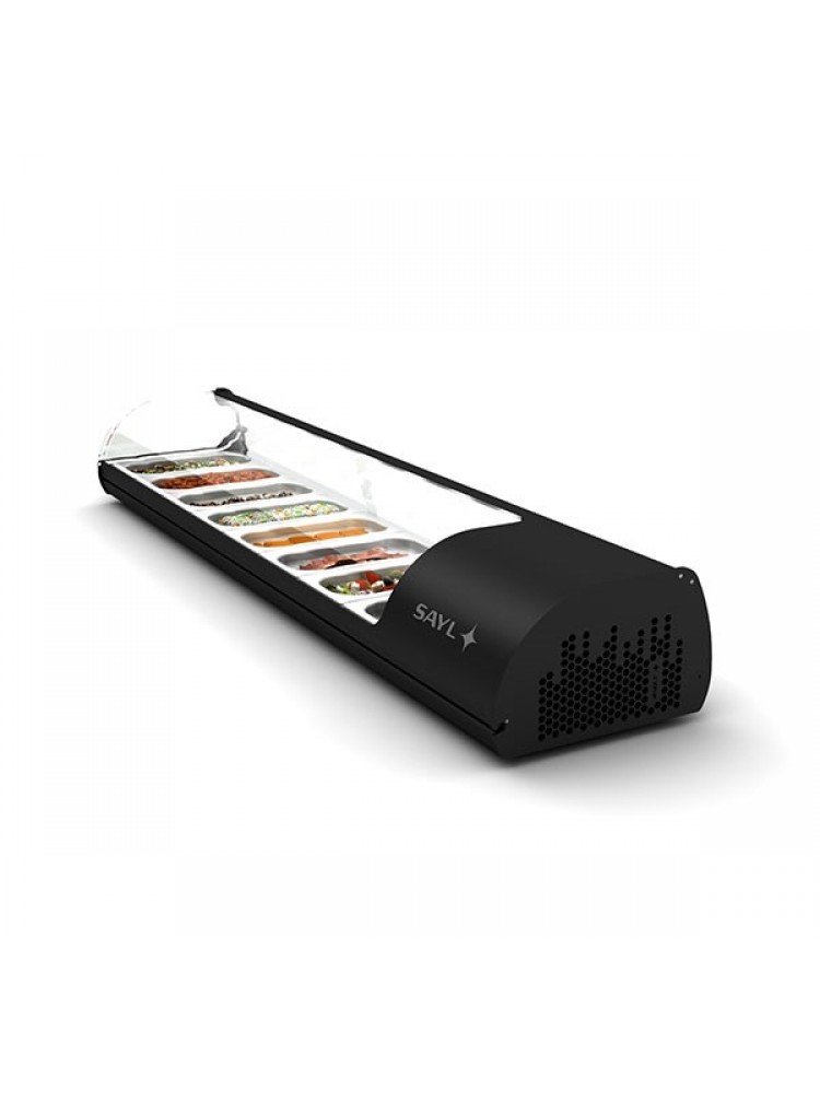 Expositor com tecnologia de baixo consumo, superfície superior plana, dobradiça frontal invisível, termostato eletrónico regulável "Sayl-Blue", cuba embutida em aço inoxidável com drenagem e sem ângulos para facilitar a limpeza, high power LEDs de última geração e consumo mínimo, compressor hermético turbo silencioso, de qualidade de topo "Secop", design pensado para evitar que o ar quente seja expulso na direção do cliente e vidro rebatível para facilitar a sua limpeza.