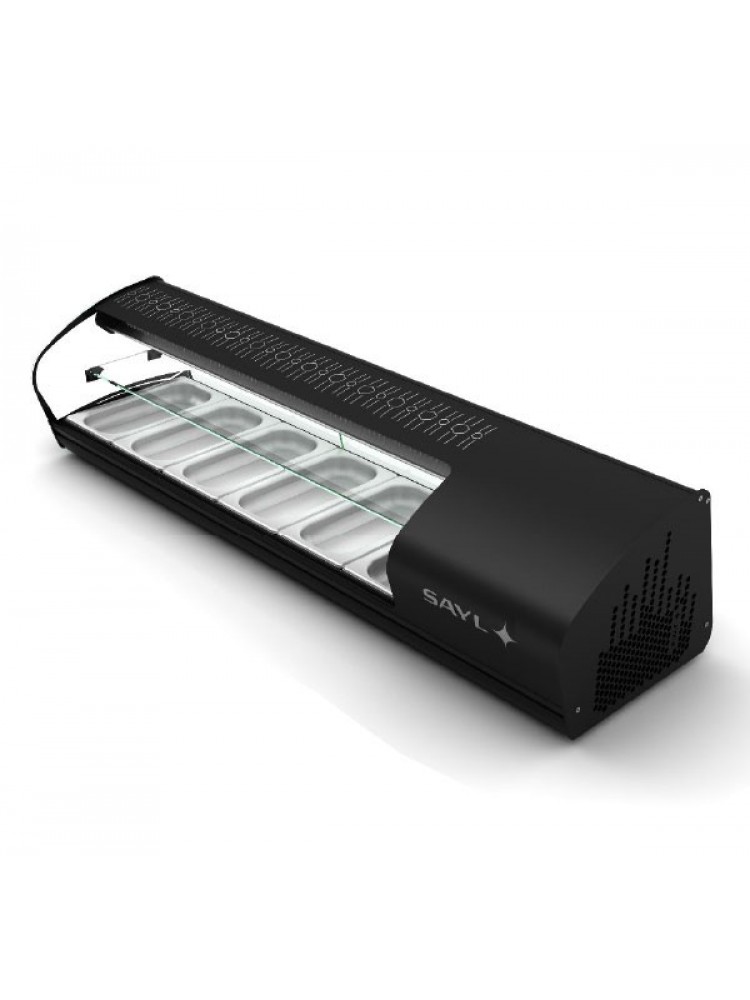 Expositor com espetacular design e uma tecnologia de baixo consumo, termostato eletrónico regulável "Sayl-Blue", sensores eletrónicos ocultos de possíveis manipulações, porta de correr de fácil de fácil extração e limpeza, cuba embutida em aço inoxidável sem ângulos que facilitam a limpeza, topo em vidro serigrafado resistente a golpes, fricção e ácidos, compressor hermético silenciado com duplo condensador turbo ventilado de alta qualidade danfoss, modelos compactos de balcão sem necessidade de instalação, zona de serviço e pés ajustáveis.